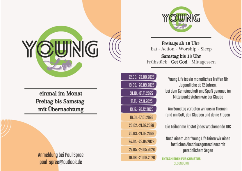 Am Freitag, 24. April 2026 startet um 18:00 Uhr wieder das monatliche Treffen für Jugendliche ab 12 Jahren (Young Life), bei dem Gemeinschaft (Essen, Aktionen, Lobpreis, Übernachtung) und Spaß genauso im Mittelpunkt stehen wie der Glaube.