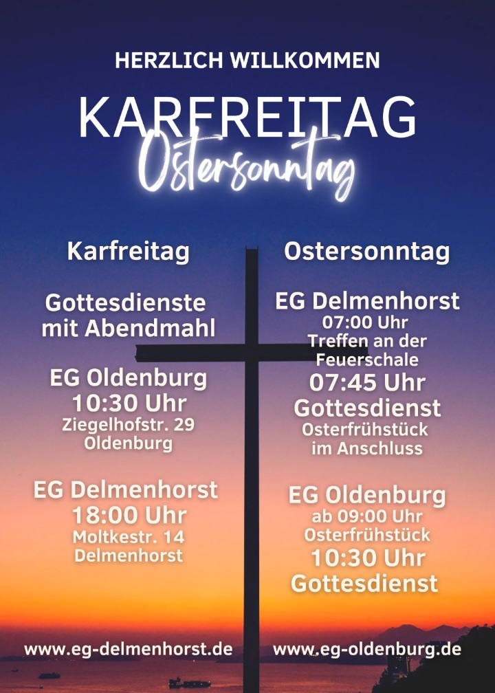 Wer lieber in Delmenhorst zum Gottesdienst möchte, kann gerne am Karfreitag um 18:00 Uhr in die Moltkestraße 14 kommen. Am Ostersonntag treffen wir uns an der Feuerschale um 7:00 Uhr, der Gottesdienst beginnt um 7:45 Uhr und ein Osterfrühstück findet anschließend statt. Herzliche Einladung!