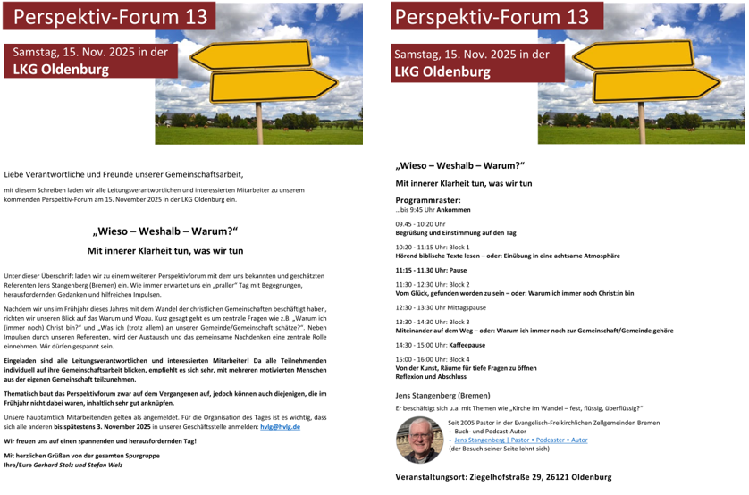 Unter dieser Überschrift laden wir zu einem weiteren Perspektivforum mit dem uns bekannten und geschätzten Referenten Jens Stangenberg (Bremen) ein. Wie immer erwartet uns ein „praller“ Tag mit Begegnungen, herausfordernden Gedanken und hilfreichen Impulsen. Nachdem wir uns im Frühjahr dieses Jahres mit dem Wandel der christlichen Gemeinschaften beschäftigt haben, richten wir unseren Blick auf das Warum und Wozu. Kurz gesagt geht es um zentrale Fragen wie z.B. „Warum ich (immer noch) Christ bin?“ und „Was ich (trotz allem) an unserer Gemeinde/ Gemeinschaft schätze?“. Neben Impulsen durch unseren Referenten, wird der Austausch und das gemeinsame Nachdenken eine zentrale Rolle einnehmen. Wir dürfen gespannt sein.