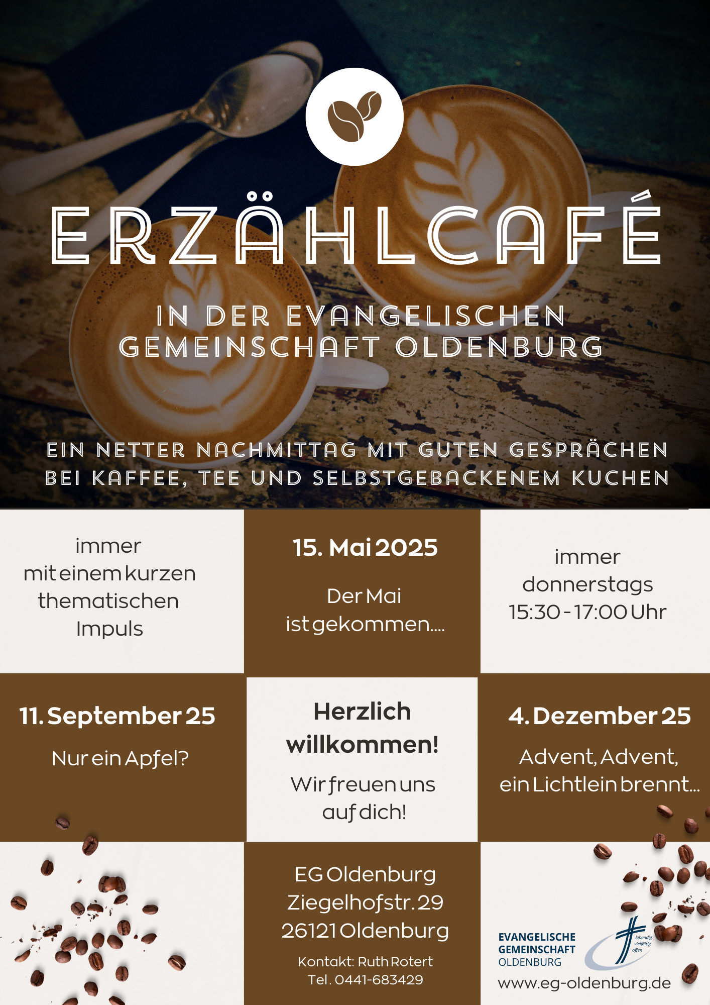 Am 4. Dezember 2025 laden wir wieder zu unserem Erzählcafé ein. Wir treffen uns in der Evangelischen Gemeinschaft Oldenburg von 15:30 bis 17:00 Uhr. Neben Kaffee, Tee und selbst gebackenem Kuchen wird es ein ganz besonderes Schauspiel zum Thema „Advent, Advent, ein Lichtlein brennt“ geben. Natürlich singen wir auch gemeinsam einige unserer Lieblings-Adventslieder. Der Eintritt ist frei. Spenden werden gerne angenommen. Ein herzliches Willkommen!
