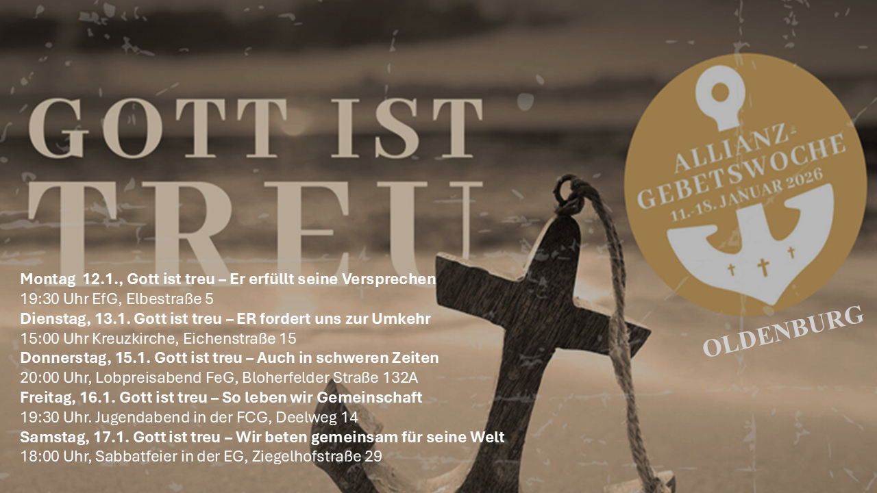 Die Allianzgebetswoche vom 11. bis 18. Januar 2026 lädt Christinnen und Christen europaweit ein, über Gottes Treue nachzudenken und gemeinsam zu beten. Hier in Oldenburg haben die Oldenburger Gemeinden ein ganz besonderes Programm zusammengestellt. Zu uns in die EG laden wir am Samstag, den 17. Januar 2026 zu einer ökumenischen Sabbatfeier mit Mitbring-Bufett ein zum Thema: „Gott ist treu – Wir beten gemeinsam für seine Welt“. Seid herzlich Willkommen in unserem schönen Café!